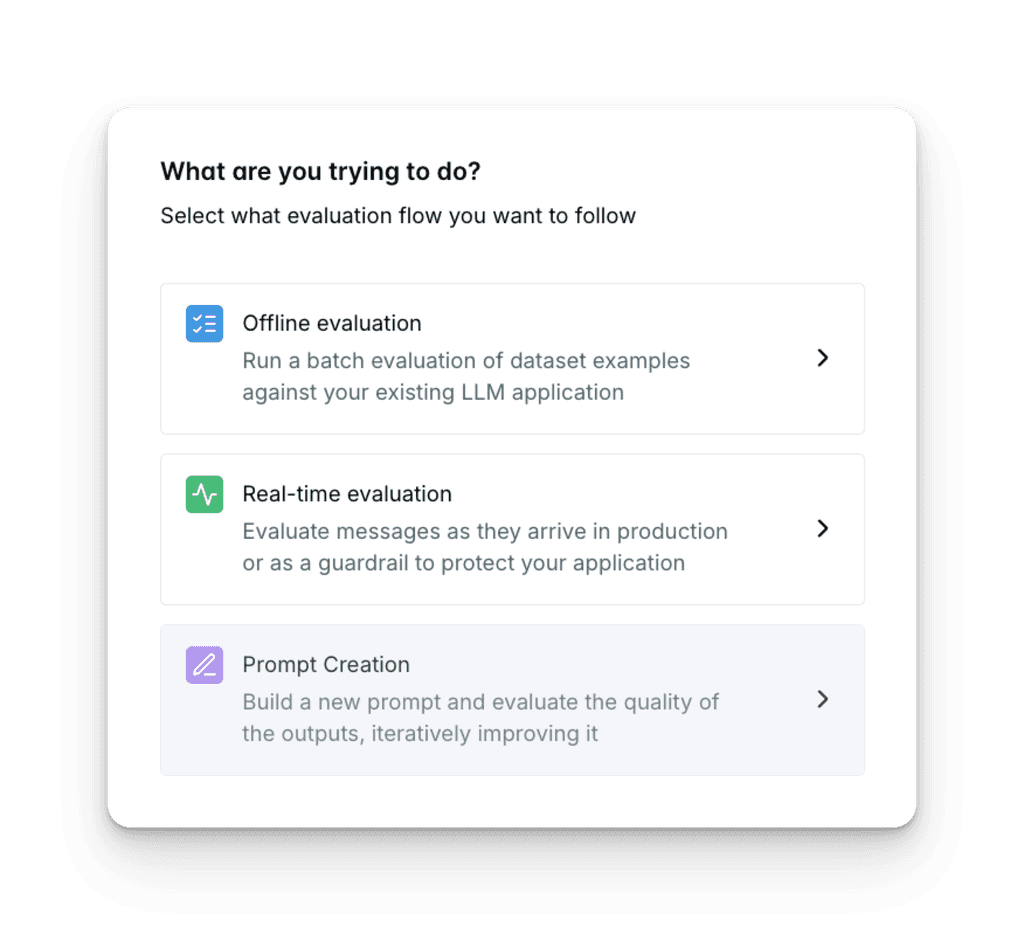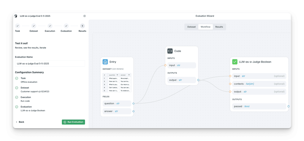 Enable both engineers and non-technical stakeholders to quickly set up LLM evaluations using: