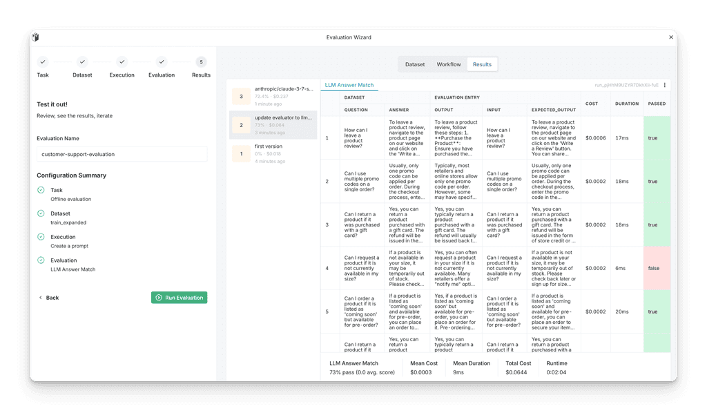 Define evaluation criteria, run tests automatically in production, and catch regressions before they reach production.