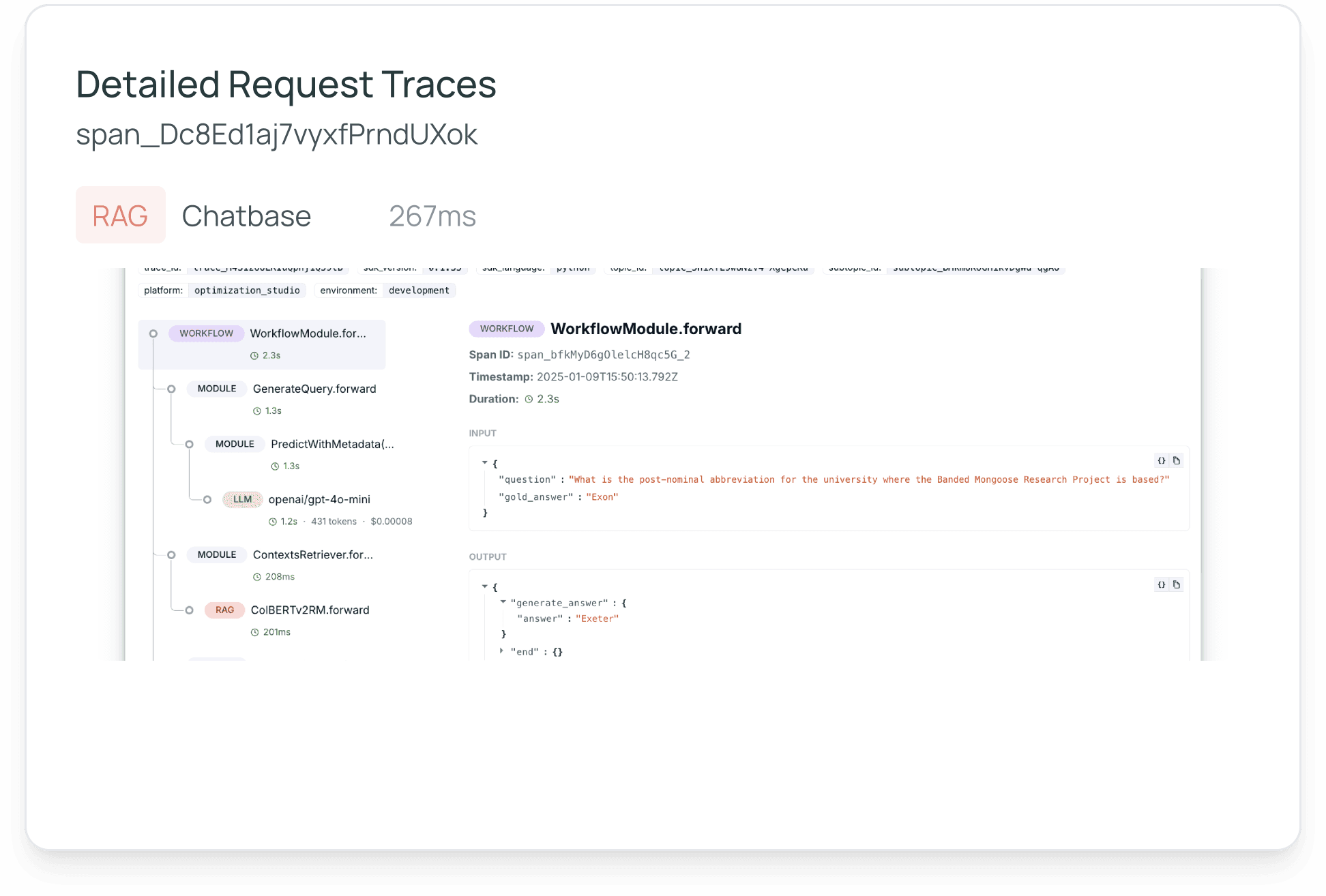 Get actionable insights to improve performance, catch failures before they impact users, and optimize your AI investments.